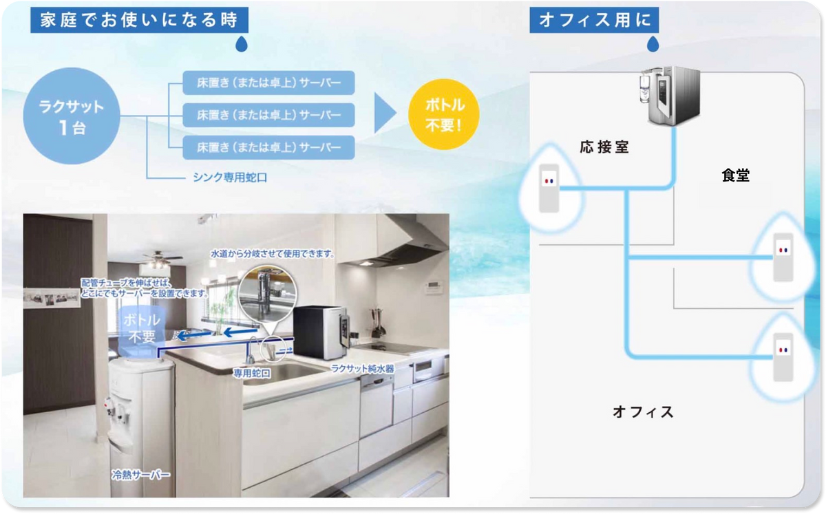 オフィスの給湯室にラクサット純水器とボトル不要の冷熱サーバーを設置しご使用いただいています。 一度に大量に水を使用できるよう、別置きタンクもご使用いただいています。