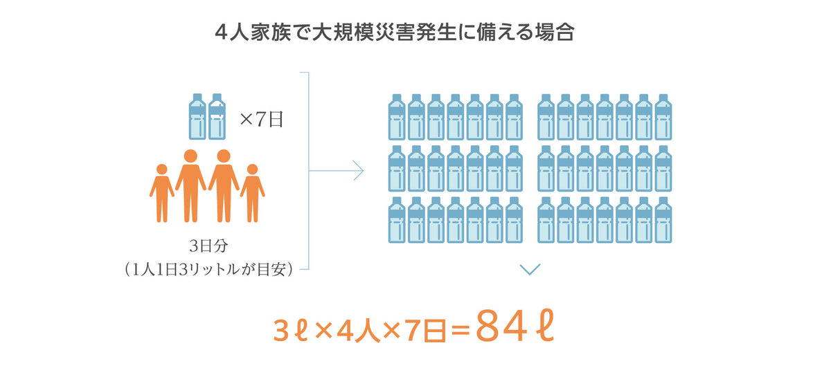 食料・飲料・生活必需品などの備蓄の例として、内閣府のWEBサイト情報では飲料水は3日分(1人1日3リットルが目安)とされています。大規模災害発生時には「一週間分」の備蓄が望ましいと記載されています。