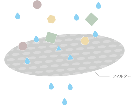 浄水技術は、簡単に言うと「ものすごく小さな穴の空いたフィルターに水を通すことで、水より大きな物質を取り除いていく技術」のことです。ラクサットレスキューに搭載している超微孔フィルターは、水分子しか通さない最高品質のもの。体に良い働きをするミネラル等も取り除いてしまいますが、雑菌や有害物質も残さず取り除き、ろ過します。