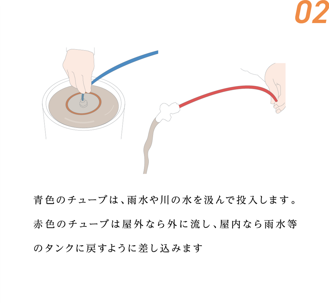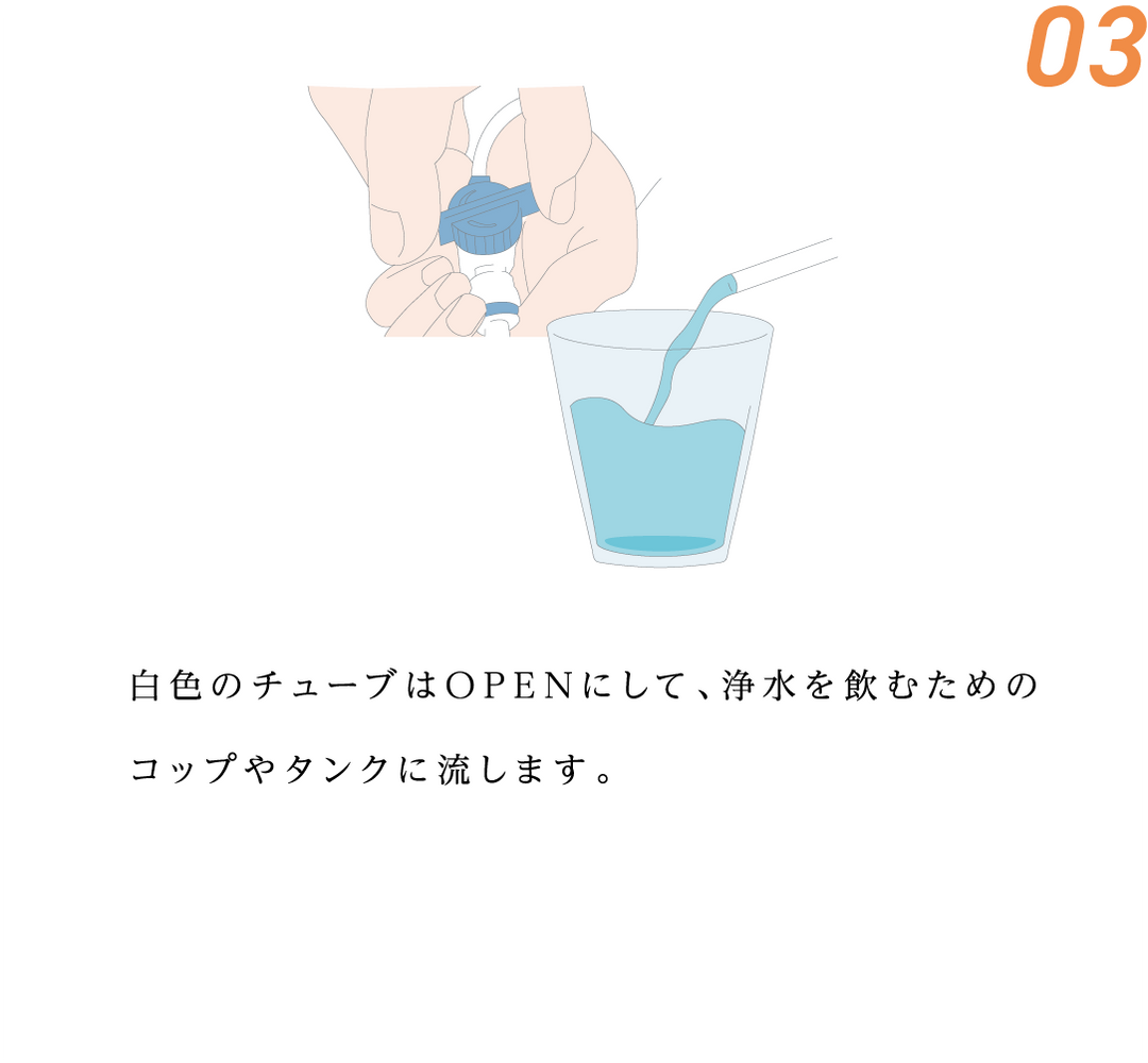 付属品 | ・汚水用(折りたたみ式)1個 ・浄水タンク(折りたたみ式)1個 ・水質浄化剤 A・B剤 2袋 ・次亜塩素酸ナトリウム ・衛生管理用品 ・TDSメーター |