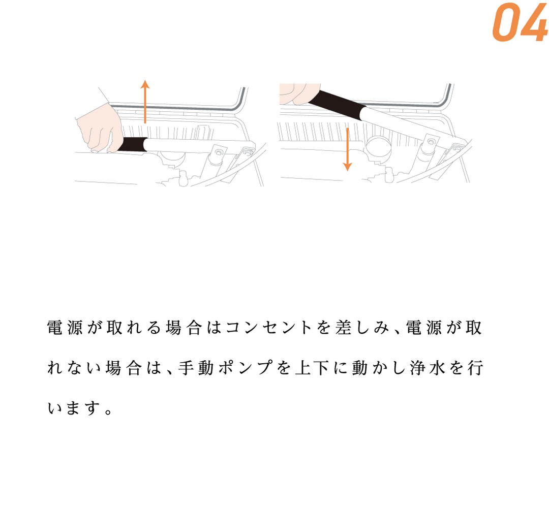 災害時に心配となり動力も心配不要。電力がなくても手動ポンプも搭載しているためどこでも安心の浄水を精製できます。
