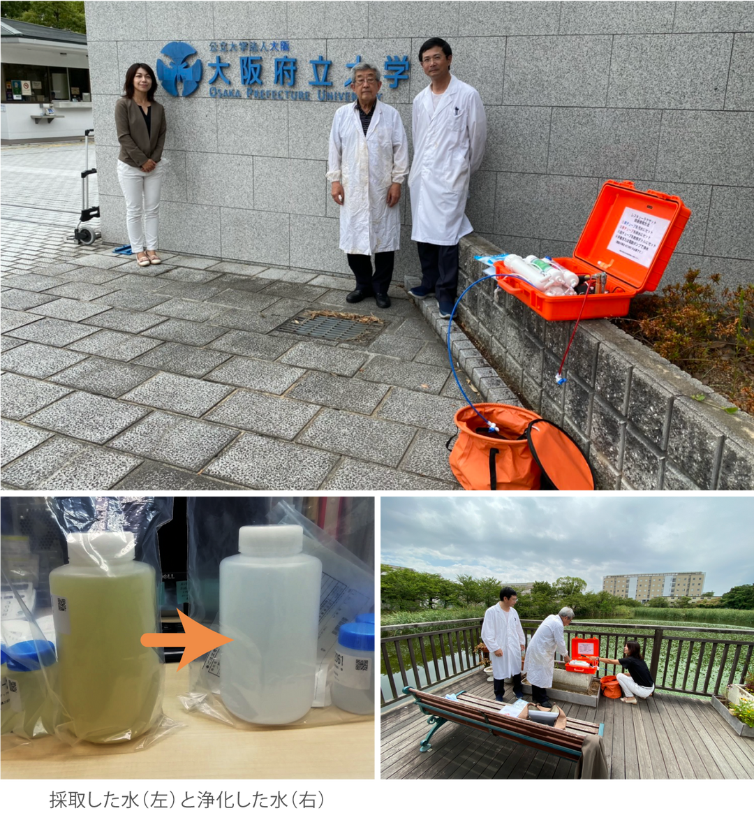 大阪府立大学の前田教授にご協力を頂き、ラクサットレスキューで貯水池の水を飲み水まで浄水できるか実験しました。一般細菌を含めた8項目で浄水性能を調べ、全ての項目で飲み水の基準を満たす浄水性能を確認。全ての方に安心・安全に使って頂けるよう、浄水機能や設備について日々研究と実験を重ねています。