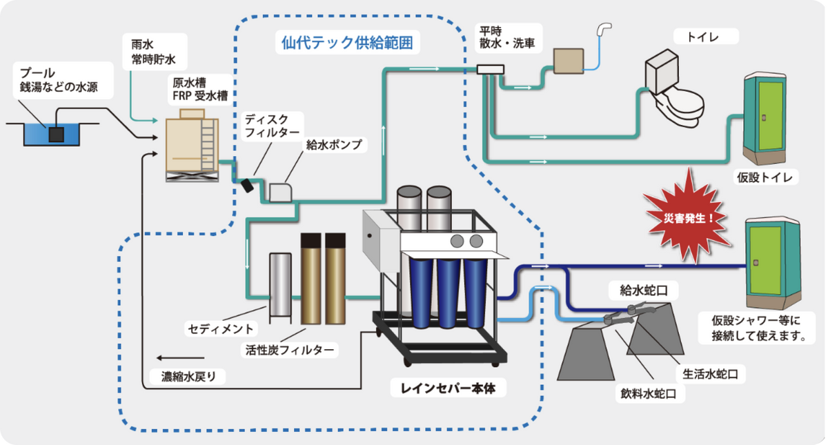 レインセパーアクアシステムは、災害時に対応する浄水&給水インフラです。