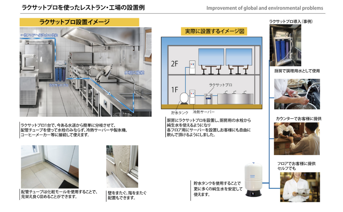 飲食店などで提供する飲み水はもちろんのこと、蛇口から出るお水や、製氷器の氷など、施設全体のお水をRO水として提供することが可能です。
