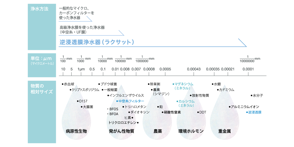 宇宙飛行士の飲み水を作るために開発されたもので、安心安全を徹底して追求しています。1,000万分の1という超微孔フィルターによる逆浸透法によって高度にろ過された水を作り上げることができる技術です。